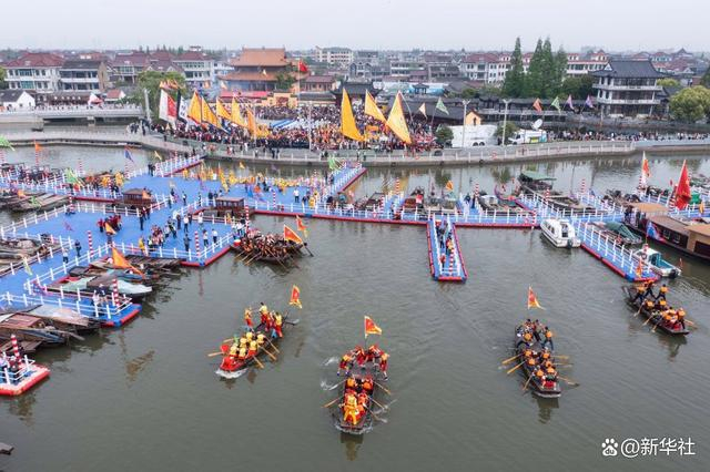 ↑ 2023年4月18日,传统踏白船表演在王江泾镇莲泗荡的网船会现场举行,江浙沪一带渔民、船民纷纷驾船前来赶庙会,呈现一场“水上民俗盛宴”。