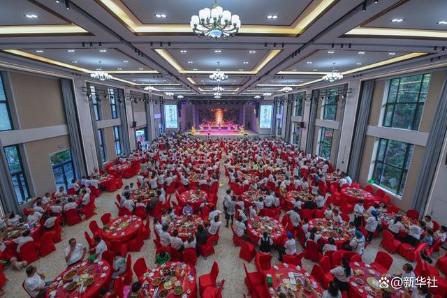 ↑ 2023年5月27日,梅坪村的村民在新建成的文化中心内的村文化礼堂,参加百家宴并观看文艺演出。