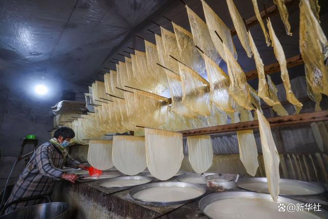 ↑ 2024年1月16日,在诸暨市安华镇勾乘山村,村民宣保凤在制作传统豆腐皮。春节临近,浙江省诸暨市安华镇的传统年货——豆腐皮迎来销售旺季。村民加紧制作豆腐皮,供应节日市场。安华镇勾乘山村是安华豆腐皮的发源地和主要产区,村民凭着自己的勤劳和智慧,把安华豆腐皮做成了当地的一张 “金名片”。