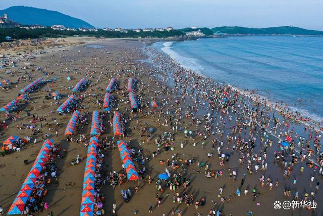 ↑ 2023年7月8日拍摄的朱家尖南沙景区。7月初开始,地处东海之滨的浙江省舟山市朱家尖南沙景区、东沙景区迎来了暑期旅游旺季,景区日均游客量在2万人次左右。