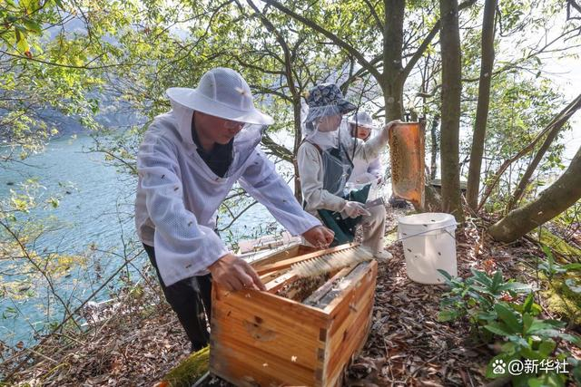 ↑ 2023年11月14日,淳安县金峰乡中华蜂保种基地工作人员在养殖中华蜂的小岛收“淳蜜共富”的蜂蜜。