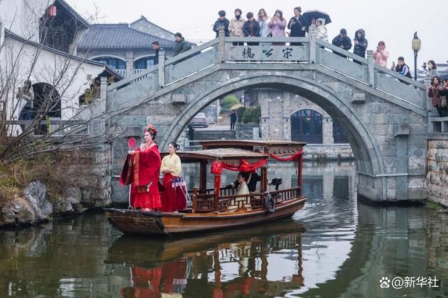 ↑ 2024年1月18日,中外青年身着传统服饰在建德严州古城的船上体验传统水上婚礼习俗,包括出阁、梳妆、登船、亲迎、礼拜等多个环节。
