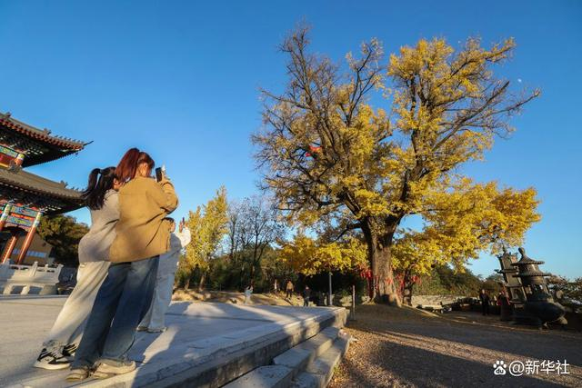 ↑ 2023年11月21日,游客在观赏拍摄诸暨市店口镇杭坞山顶的古银杏树。初冬时节,杭坞山顶三德寺门外有着500年和300年树龄的两株古银杏金黄满树,成为当地山乡美丽的风景。