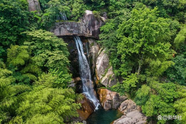 ↑ 2023年5月16日在浙江省台州市天台县天台山风景旅游区拍摄的石梁飞瀑一景。石梁飞瀑景点有一条巨大石梁横跨在两崖之间,瀑布水流从梁底穿过,坠入幽谷之中。徐霞客在游记中写道:“下瞰深潭,毛骨俱悚。”