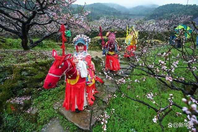 ↑ 2023年3月25日拍摄的在半山村的桃园内进行的传统竹马表演。浙江省杭州市富阳区新登镇首届山花大会暨第二十届半山桃花节在半山村启幕,半山村迎来了一年中最美、也是最热闹的时节,千余亩竞相开放的桃花和现场的民俗表演吸引游客前来观赏。
