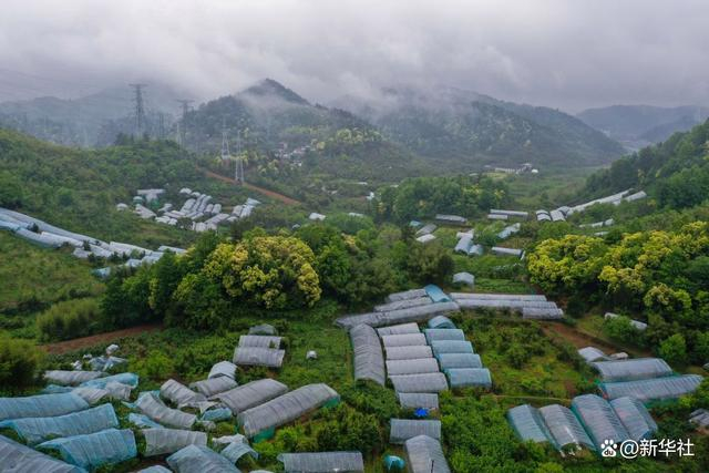 ↑ 2023年4月23日,细雨中的杭州市临安区锦南街道上甘村樱桃谷拍摄的樱桃大棚。