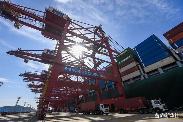 ↑ 2023年1月31日,在宁波舟山港金塘港区大浦口集装箱码头上,一艘外籍货轮在靠泊卸货。