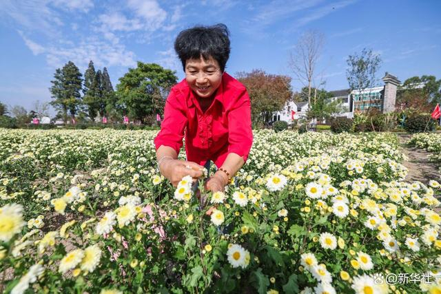 ↑ 2023年11月4日,村民许巧芬在杭白菊基地里采摘杭白菊。桐乡是杭白菊原产地,被誉为“中国杭白菊之乡”。