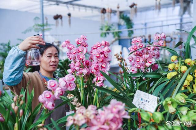 ↑ 2024年1月4日,澧浦镇花卉苗木城内一家商户的工作人员给大花蕙兰喷水。元旦过后,浙江省金华市金东区澧浦镇花卉苗木城内,600余家花卉苗木商户开始展销不同品种的年宵花,1000多个品种的年宵花卉供市民、游客挑选。