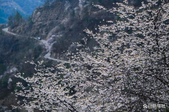 ↑ 2023年2月28日拍摄的三都镇前源村山坡旁盛开着的野樱花。