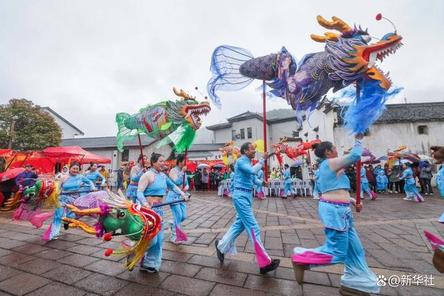 ↑ 2024年1月20日,在太湖源镇红叶指南村落景区举行的传统鳌鱼灯表演。