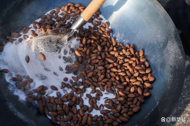 ↑ 2023年10月22日,香榧种植户们正在用盐炒制香榧。
