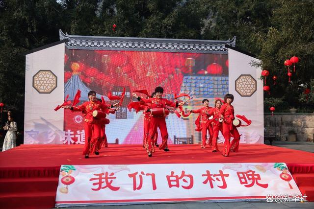 ↑ 2023年12月28日,诸暨市赵家镇村民在村晚舞台上表演腰鼓。当日,在浙江省诸暨市赵家镇香榧国家森林公园的香榧文化会馆举行了一台“家乡村晚”。这台家乡村晚由当地百姓共同参与演出,特色产业、文旅景点等多重元素融合带来了浓浓年味,让百姓在欢乐喜庆的气氛中迎接新年的到来。