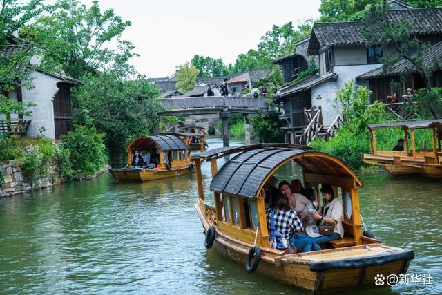 ↑ 2023年5月2日,游客在濮院时尚古镇内乘船游览。