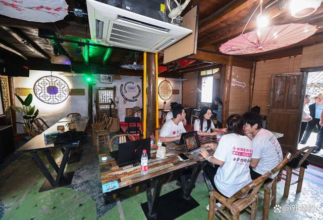↑ 2023年8月11日,高校艺术院系的大学生们在葛家村的特色酒吧内讨论村落艺术改造提升的设计方案。浙江省宁波市宁海县大佳何镇葛家村从2021年开始推进艺术振兴乡村特色新路径,采用“租金+入股”方式,由高校艺术院校师生及当地村干部带领村民开展手工艺品制作、文创作品销售、即食餐饮经营,打造艺术庭院和“艺起富”共富工坊等,形成一批“乡村创客”旅游业态品牌,实现村民家门口创业就业,年游客量超10万余人。