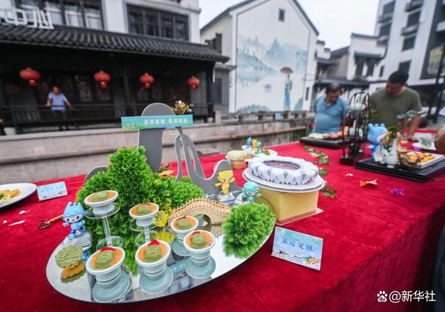 ↑ 2023年9月6日,在浙江省建德市寿昌古镇开幕的古镇好吃节上,由建德市餐饮协会制作的“鱼跃亚运”“腾龙飞天”“亚运定胜”“金牌满堂”等多道亚运主题菜品在现场展示,吸引了众多市民的眼球。
