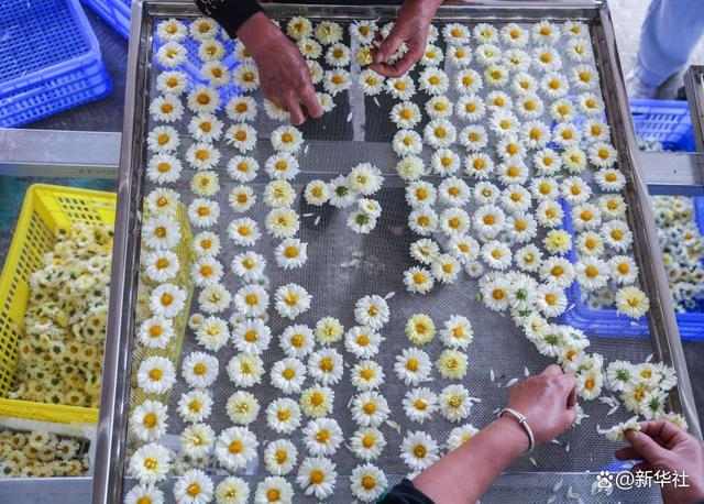 ↑ 2023年11月4日,在三村村一家现代农业企业内,村民分拣刚刚采摘的杭白菊。