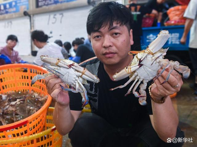 ↑ 2023年8月7日,在舟山普陀沈家门舟山国际水产城码头,商户在展示刚刚捕捞上岸的梭子蟹。