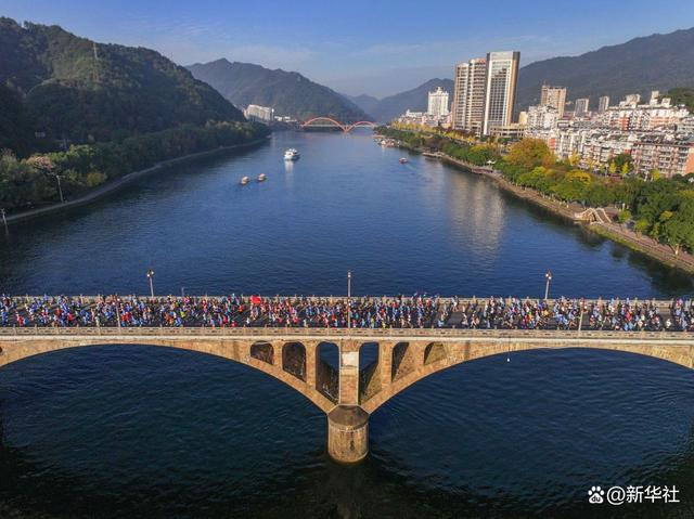 ↑ 2023年11月19日,参赛选手在比赛中经过白沙大桥。当日,浙江省建德市举行建德17℃新安江马拉松比赛。赛事设置全程马拉松、半程马拉松和欢乐跑项目,路线沿新安江途经多个建德景区和地标。