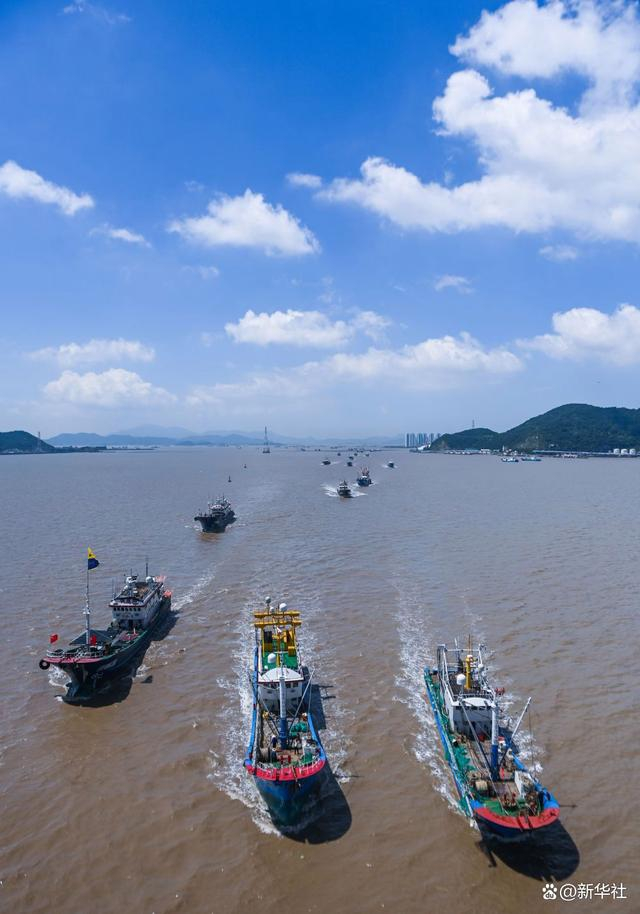 ↑ 2023年8月6日,渔船从舟山普陀沈家门渔港驶出,前往东海渔场。