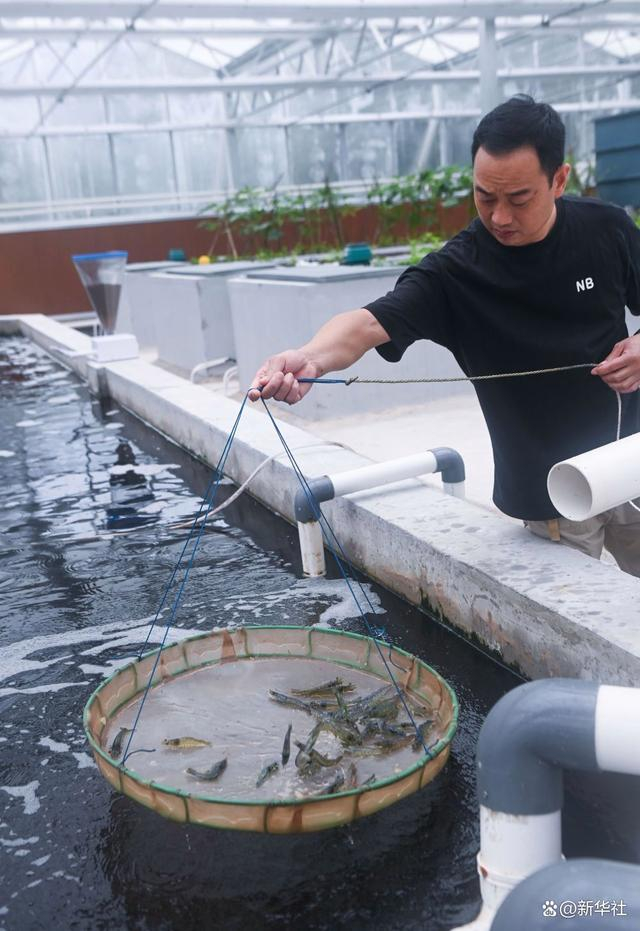 ↑ 2023年9月13日,回乡创业的农创客徐建刚在“鱼菜共生”共富工坊的海水养殖池内,查看南美白对虾的长势情况。
