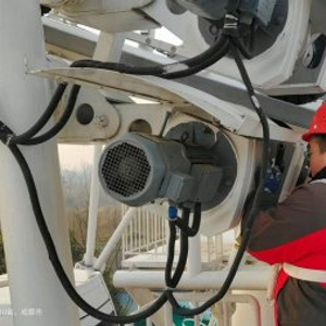 穿上五点式安全带,将止回钩套上爬梯上的钢绳,董立君和同事季清林一前一后开始往上爬。大约7分钟后,两人来到了顶部平台。找到油嘴加油、检查螺栓松紧度、更换厚度低于3毫米的电刷并添加导电膏……一趟检查下来,至少需要20分钟。