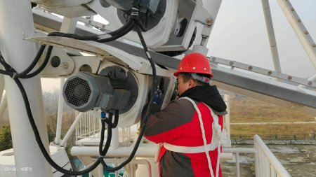 在驱动装置平台上进行的是每日例行检查工作,而每隔3个月,尤其在节假日前,维保人员则要爬上53米高的顶部平台,进行更全面的检查。