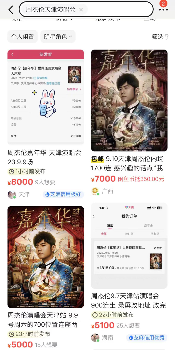 比如在天津演唱会期间,原本300起售的票价被哄抬到700起,甚至还有15万两张连坐票的天价。