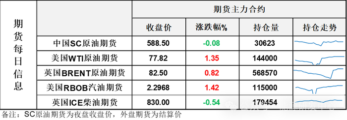 【1】WTI主力原油期货收涨1.04美元,涨幅1.35%,报77.82美元/桶;布伦特主力原油期货收涨0.67美元,涨幅0.82%,报82.5美元/桶;INE原油期货收跌0.08%,报588.5元。