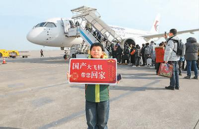 1月26日,在上海虹桥机场,一位小旅客手举标语牌在国产大型客机C919前合影。这是C919首度服务春运。新华社发