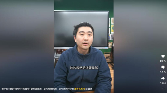 1月29日晚间,在抖音上拥有230多万粉丝的博主“杨藩讲艺术”发布两条视频称,与辉同行直播间大规模抄袭自己的文案。