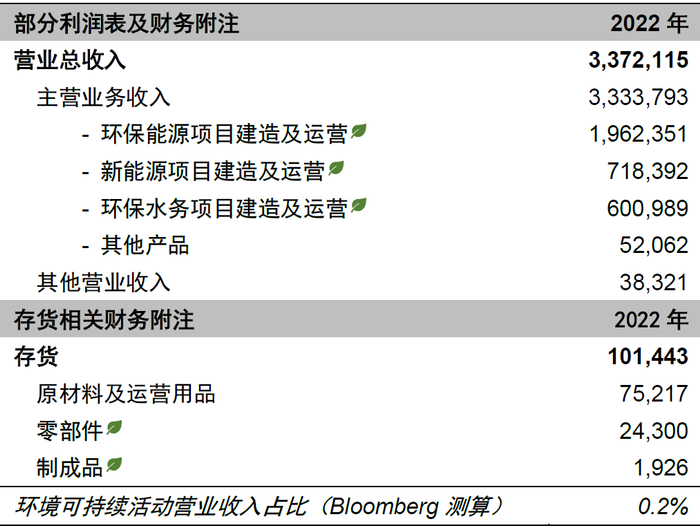 结合财务报表和附注内容,我们获取到该上市公司如下原始数据。根据如下表格,以绿色为背景色标注出了与绿色相关的主营业务收入为“环保能源项目建造及运营”、“新能源项目建造及运营”和“环保水务项目建造及运营”。在存货 中,我们根据年报的描述,认定“零部件”和“制成品”属于绿色资产。因此,我们可以计算出: