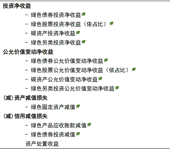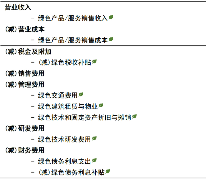 首先,来看下述利润表中与企业经营密切相关的科目,我们在利润表的科目中,标注出了与绿色经济活动相关的元素,以下几个比率可以直接反映企业的绿色资产占比: