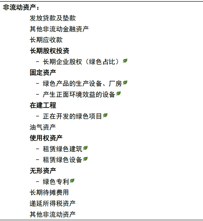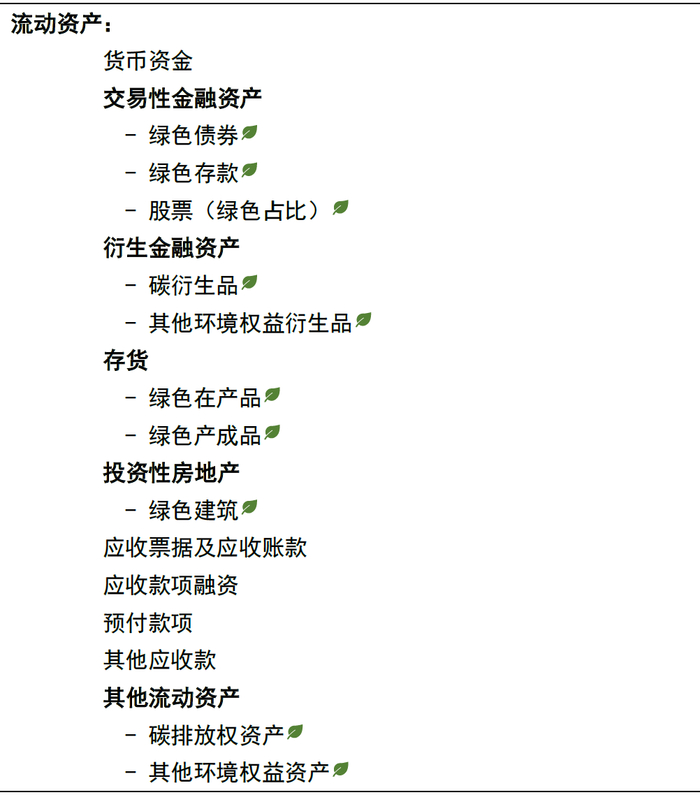 注:财务科目名称后标记为绿色叶子图标,表示该项属于绿色资产。