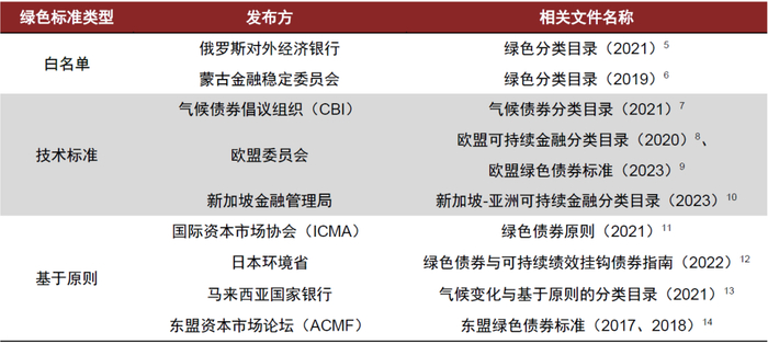 资料来源:中国人民银行,发展改革委,证监会,俄罗斯对外经济银行,蒙古金融稳定委员会,欧盟委员会,新加坡金融管理局,国际资本市场协会,日本环境省,马来西亚国家银行,东盟资本市场论坛,中金公司研究部