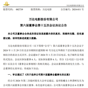 1月29日晚,万达电影(002739.SZ)发布公告,经相关会议审议通过,选举陈曦和龚峤为公司第六届董事会非独立董事,选举陈曦任万达电影董事长兼总裁。