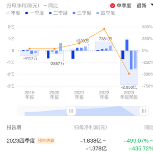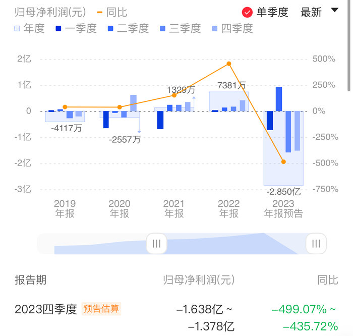 其中,该公司2023年Q4预计亏损1.38亿元至1.64亿元,与Q3亏损额整体相当。