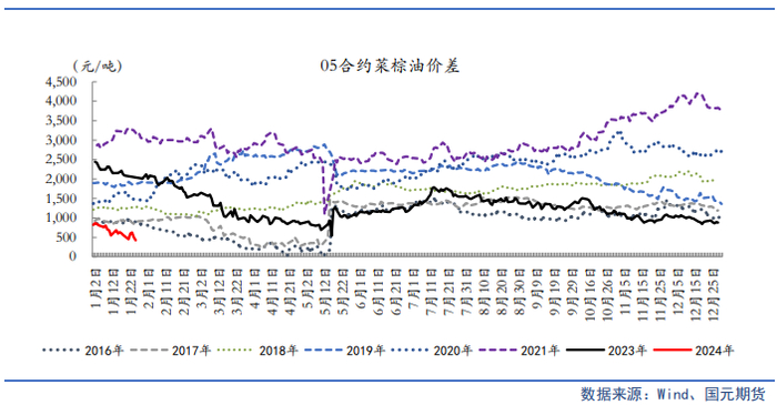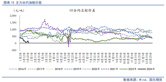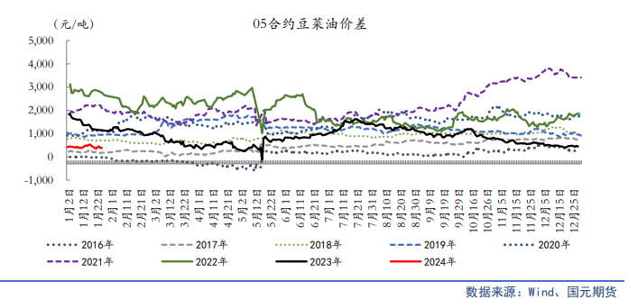 2405豆棕油价差预计走缩,目标区间-100~-150元/吨,2405菜棕油价差预计走缩,目标区间300~400。