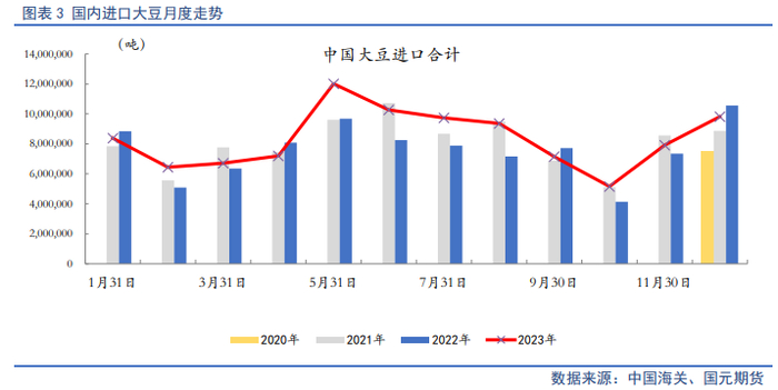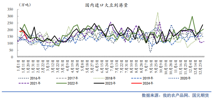 据海关总署数据显示:23年12月份中国大豆进口量982万吨,同比去年减少74万吨,同比减幅7%;环比11月进口量增加190万吨,环比增幅24%。此外,23年1-12月份进口大豆累计9941万吨,同比增加833万吨。据Mysteel农产品团队对国内各港口到船预估初步统计,24年2月560万吨,3月530万吨。2023年1月份国内主要地区123家油厂大豆到港预估116船,共计约754万吨(本月船重按6.5万吨计)。