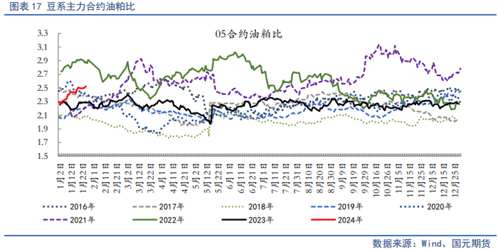 目前部分巴西大豆产区开始收割,尽管部分产区给出的初期单产预期偏低,导致一些机构持续下调巴西新作大豆产量,但从南美整体产量来看,出现翻转性变化概率较小。而且持续充沛的降水也不短冲击巴西升贴水报价,截至1月19日当周,巴西港口大豆报价加速下跌,创下2020年8月5日以来最低值,近月CNF跌至历史同期低位,同时低于美豆价格,给予美豆以可预期的下方空间。