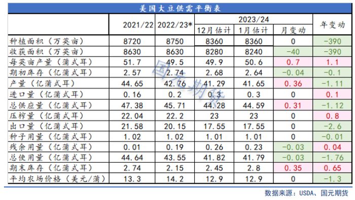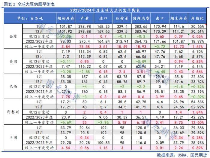 13日凌晨,USDA发布美豆1月供需报告,对市场利空看待。报告利空数据主要在于超预期调高2023/24年度美豆单产、产量及期末库存以及上调阿根廷新作大豆产量。此前由于厄尔尼诺气候影响,巴西部分大豆产区受干旱冲击,部分地区单产下调,不过从机构数据及USDA本次报告给出的预测数据,南美丰产的格局并未发生改变。预计随着一二季度南美大豆进入收割季,全球大豆供应端补充将继续维持充足预期,中长期施压CBOT大豆价格。据美农报告数据显示,巴西新作产量环比下调至1.57亿吨,市场预期 1.567亿吨,前月为1.61亿吨;阿根廷新豆产量5000万吨,市场预期4870万吨,前月为4800万吨。
