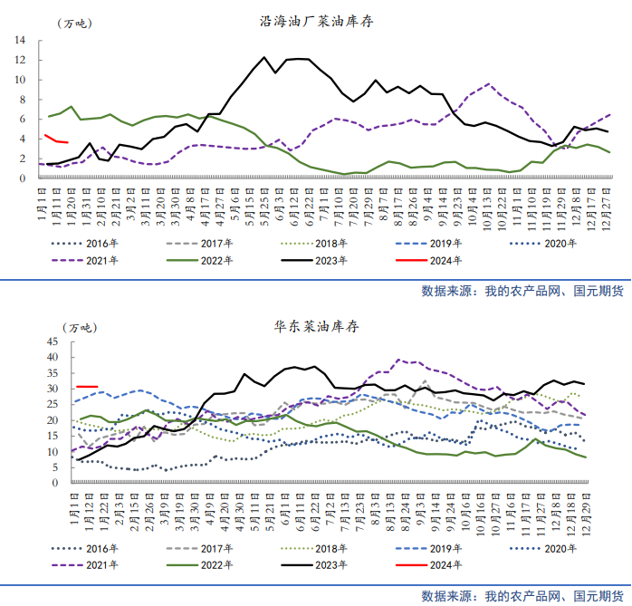 据Mysteel调研显示,截止到2024年1月26日,沿海地区主要油厂菜籽库存为33.17万吨,较上周减少2.33万吨;菜油库存为3.53万吨,较上周减少0.22万吨;未执行合同为13.08万吨,环比上周减少0.82万吨。截止至2024年1月26日(第4周),华东地区主要油厂菜油商业库存约29.95万吨,环比上周减少0.75万吨,环比减少2.44%万吨。