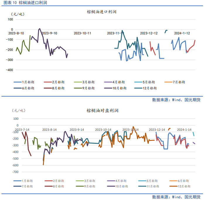 1月马棕仍处在减产周期中,而对出口预期有所分歧。对于MPOB1月报告,市场预期将继续下调期末库存预期。据南部半岛棕榈油压榨商协会(SPPOMA)数据显示,2024年1月1-25日马来西亚棕榈油单产减少11.59%,出油率减少0.54%,产量减少14%。船运调查机构Societe Generale de Surveillance(SGS)公布的数据显示,预计马来西亚1月1-25日棕榈油出口量为919139吨,较上月同期出口的1038834吨减少11.52%。独立检验公司Amspec Agri发布的数据显示,马来西亚1月1-25日棕榈油出口量为1006930吨,较上月同期出口的1100133吨减少8.47%。据船运调查机构Intertek Testing Services(简称ITS)数据显示,马来西亚1月1-25日棕榈油出口量为1064778吨,较上月同期出口的1057955吨增加0.64%。