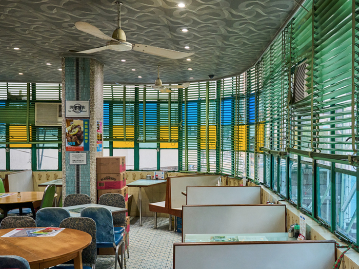 冰室的怀旧味道让从小喜欢追TVB的板Lee十分着迷,彩色玻璃窗、马赛克瓷砖、二楼沿窗卡座、老式三叶吊扇…他眼里的美都餐室日与夜都有不同的光影魅力,让人梦回上世纪五十年代,老片里经常出现的一体式冷气机更是勾起了无数年少时代的追剧记忆。店内供应西多士、菠萝油、焗猪扒饭、红豆冰、咸柠七等经典港式风味,服务仍然朴实自然又轻快麻利。板Lee感慨在美都餐室吃的不是食物,而是旧式餐厅的情怀与历史,也没准能偶遇哪位香港明星。
