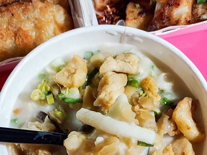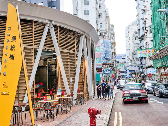 佳佳甜品附近的十八座狗仔粉也是庙街小吃届的顶流一枚,这家没有餐桌的路边摊,却贴满了与明星的合影。狗仔粉由粘米制成,粉条形似狗尾巴,故得其名,配上猪骨汤底和小虾米、猪油渣,鲜香十足。越过庙街熙熙攘攘的纪念品摊位便是吴松街,这里的临时熟食小贩市场浓缩了庙街饮食文化特色所在。穿越40年风雨的吴松街临时熟食小贩市场在2021年刚刚完成翻新,在早午市,市场里可以品尝到地道港式茶餐厅风味的快餐和奶茶,晚市则有20多家镬气十足的大牌档小炒出摊。