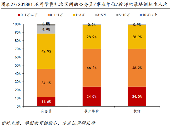提供公务员/事业单位/教师等招录和资格考试培训课程。公司主营成人非学历业务,提供全面的招录和资格考试培训、技能培训、实习实训等职业培训,围绕公务员、事业单位、教师招录考试打造主要服务,2018H1公务员/事业单位/教师面授培训分别招生16/5/8万人,占总人次的52.5%/17.5%/25.1%。
