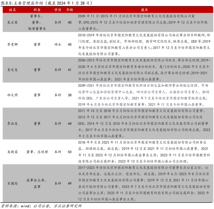 公司管理团队深耕教培行业多年,管理经验丰富。董事长吴正杲具有教育行业近15年的从业经验,历任华图董事、CFO等,企业管理经验充足。其余大部分高层管理人员相关经验超过5年,具有对行业的独到见解。目前管理层架构稳定,为以后长期稳定发展奠定了良好的基础。