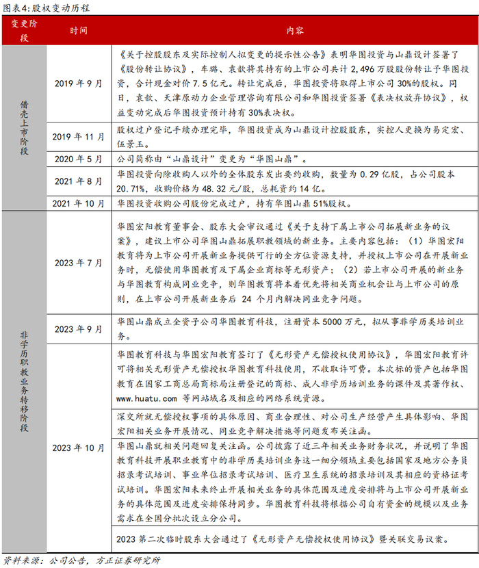 3)战略发展阶段(2019至今):2019年华图教育战略收购上市公司山鼎设计30%的股权,并于2020年将山鼎设计更名为华图山鼎;2023年华图山鼎拟拓展非学历教培业务。