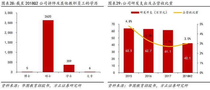 研发团队实力强劲,课程研发紧跟教学实践。公司重视自主研发能力,已投入大量资源开发课程材料,2015年/2016年/2017年/2018H1公司的研发开支分别为63.5/62.7/61.1/42.1百万元,占同期营收的4.8%/3.3%/2.7%/3.0%。截至2018Q2,公司拥有一支由36人组成的课程开发团队,团队成员在各自学科领域均具有扎实学历背景、丰富教学经验及研究成果,并且公司一线教师全体参与课程资料的研发与改进,以更好融合课堂教学实践。