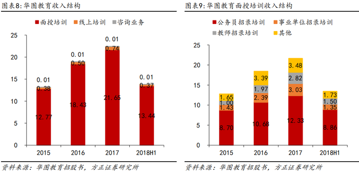 课程全面覆盖公考、事业单位招录、教师招聘等,以线下交付的面试培训为主。华图教育的课程含面授培训与线上培训,并涉及公务员招录培训、事业单位招录培训与教师招录培训等多方面。此外,公司的咨询业务每年贡献约0.01亿人民币的营业收入。2015-2018H1年面授培训业务营业收入占比均在95%以上,线上培训占比3%左右,其中线下面授中公务员培训占比50%以上。